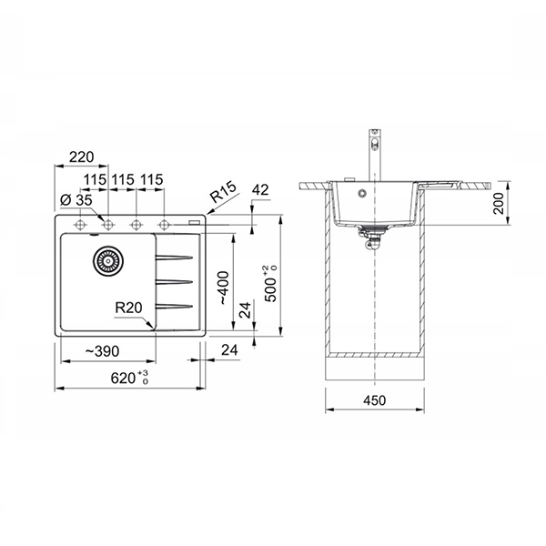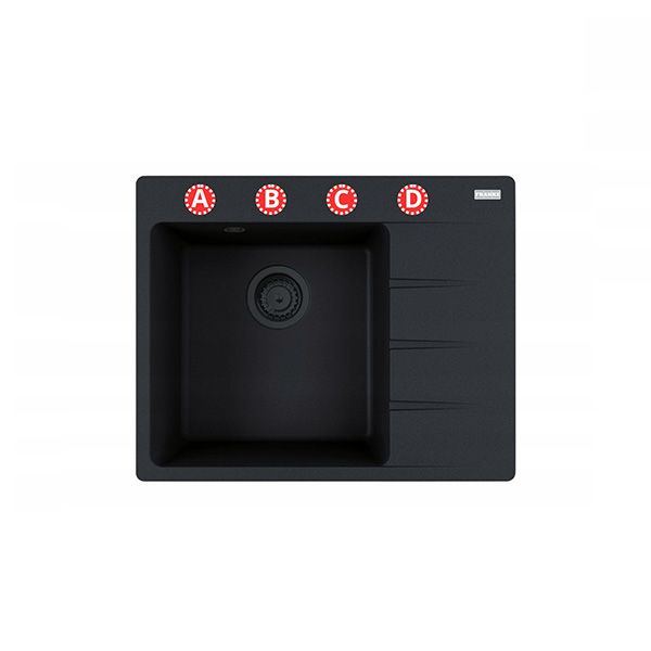 Miejsca, w których mogą być wykonane otwory zaznaczono na zdjęciu w czerwonych kółkach z przerywaną zewnętrzną linią i oznaczeniami A,B,C,D. Otwory są podfrezowane. Możliwe jest przewiercenie do 4 otworów Ø 35 w tym zlewozmywaku.
