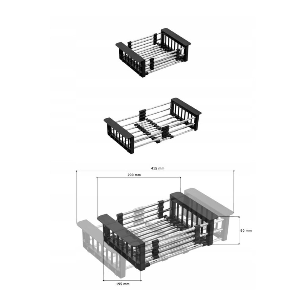 ● Teleskopowa ociekarka do zlewu. Wymiary (produkt złożony): 29 cm x 19,5 cm x 9 cm, maksymalne wymiary (po rozłożeniu): 41,5 cm x 19,5 cm x 9 cm.